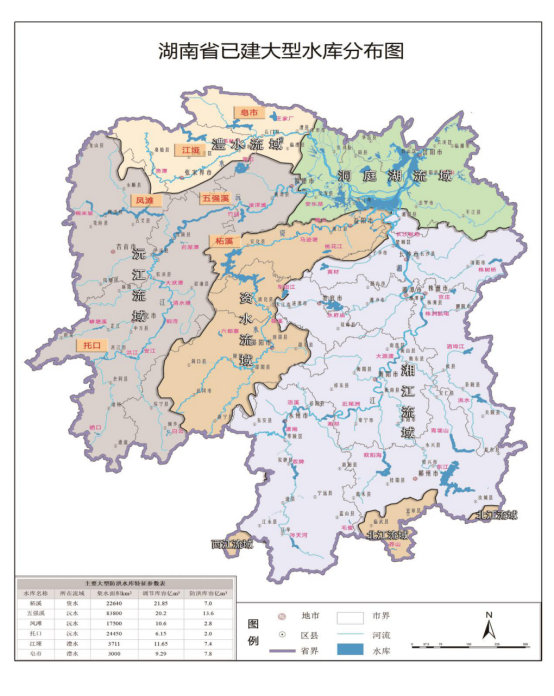 通过近一个世纪的努力,湖南境内四条江河的水库水电站开发建设已经基本完成,其中具有防洪调节性能的大型水电工程共有17处,总防洪库容达70亿m³,总调节库容达190亿m³,包括湘水的双牌、欧阳海、东江、涔天河、水府庙,资水的柘溪,沅水的五强溪、洪江、凤滩、托口、白市、三板溪,以及澧水的江垭、皂市等水库水电站。