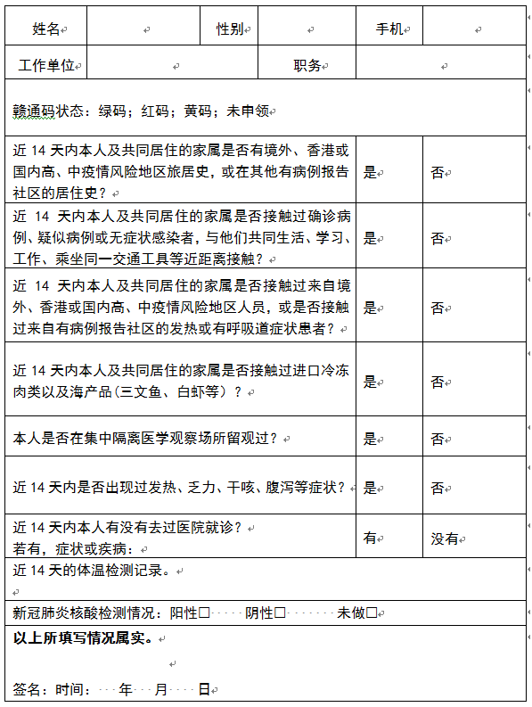 (1)健康申报。所有与会人员(含参会人员、随行人员、引导员、参观考察点工作人员、医疗防疫人员、接送站点人员、各接待酒店工作人员、司机等,下同)必须提前如实申报健康状况,报到前扫“赣州通行码”“通信大数据行程码”,在酒店办理入住时登记填写《会议人员健康申报表》。 (2)禁止参会对象。对10月6日以来有重点地区旅居史人员,9月28日以后境外入赣返赣人员,有发热(体温≥37.3℃)、咳嗽乏力、腹泻等症状人员以及免疫功能低下人员不参加会议(会务工作)。对近28天有境外旅居史的与会人员必须提供7天内(10月12日以后)的新冠病毒核酸检测阴性证明且“健康码”绿码方可参会。 (3)个人防护。与会人员、服务人员会议期间必须全程规范佩戴口罩。用过的口罩需集中弃置到指定的垃圾桶统一处理。在会议期间应保持安全社交距离。 附件1 “赣州通行码”“运营商轨迹码” 附件2 会议人员健康申报表