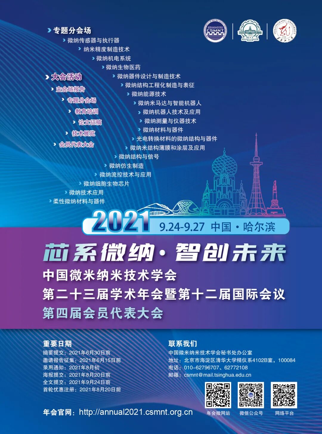 中国微米纳米技术学会第二十三届学术年会暨第十二届国际会议(简称CSMNT2021)将于2021年9月24-27日在哈尔滨市敖麓谷雅酒店举办。本期欢迎关注黄维院士!